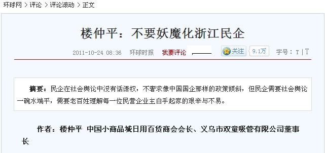 日前,某報刊登了一篇內(nèi)容為"義烏老板假破產(chǎn)真移民"的長篇報道,作者以偏概全的不實報道對義烏民營企業(yè)地形象產(chǎn)生了極大的不良影響,對此,雙童當家人樓仲平依據(jù)30多年來對義烏市場的了解,在《環(huán)球時報》上發(fā)表文章《不要妖魔化浙江民企》,澄清義烏民企現(xiàn)狀,抵制不實報道,為義烏民企正名。