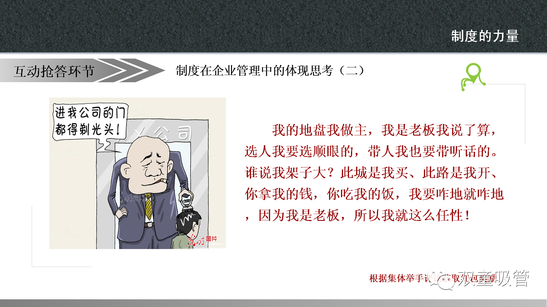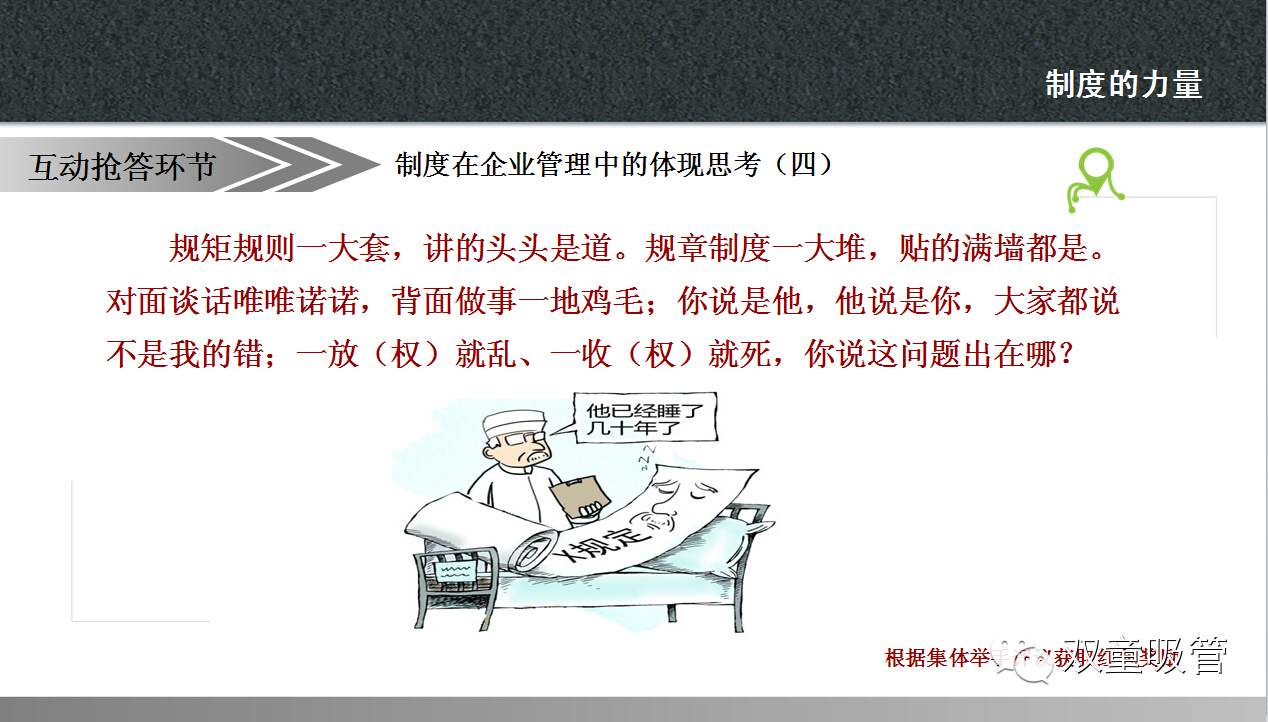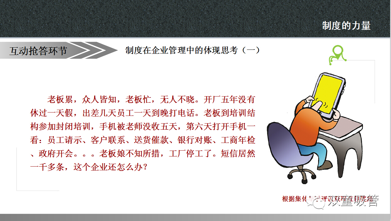 當(dāng)然啦,這樣的案例,當(dāng)家人準(zhǔn)備了許多,讓大家在快樂中學(xué)習(xí)到了制度的魅力。以前吸管妞總是有一種誤解,覺得制度就是上級用來管理下級的一種方式。通過昨天的課程終于讓妞明白了,原來制度不僅僅是有利于上級管理,更有利于雙方的權(quán)利得到保障,讓公司的流程化管理更加準(zhǔn)確高效!下面,吸管妞就把干貨放上來,大家可要好好看哦!