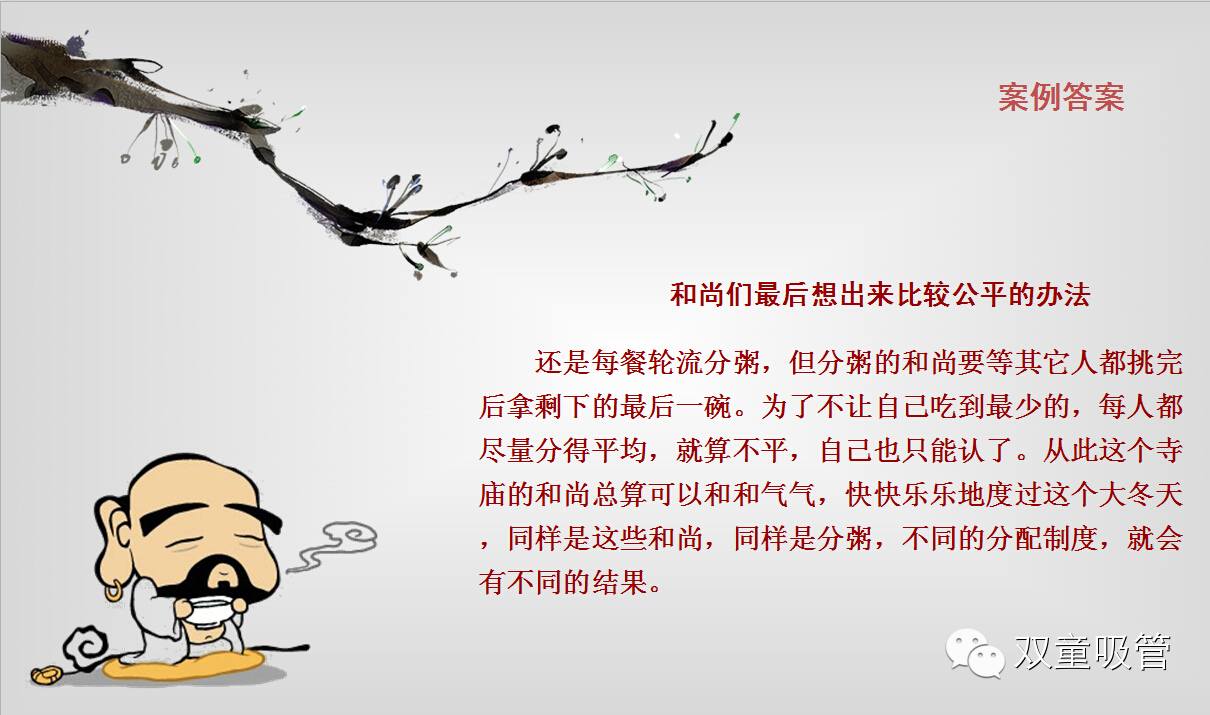 有一個山間寺廟住著一大班小和尚,因為大雪封山無法下山化緣施舍,老和尚也因為下山化緣而無法回到寺廟,每天兩餐都要靠山上村民施舍的一大桶粥過日子,要命的是人多粥少,每天都是不夠吃的。一開始他們抓鬮決定誰來分粥,每天由一個小和尚輪流分粥。于是乎每一圈下來他們只有一天是飽的,就是自己分粥的那一天;后來他們開始推選出一個道德高尚的和尚每天分粥,結(jié)果所有和尚開始挖空心思去討好他,賄賂他,一段時間后,搞得整個寺廟烏煙障氣;然后實在沒有辦法,大家又開始組成分粥委員會和監(jiān)督小組,結(jié)果也是互相攻擊、相互扯皮,每餐都要花很長的時間進(jìn)行分粥,雖然對公平了,但吃到嘴里的粥全是冰冷冷的。