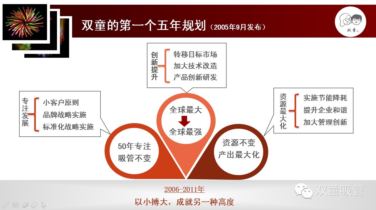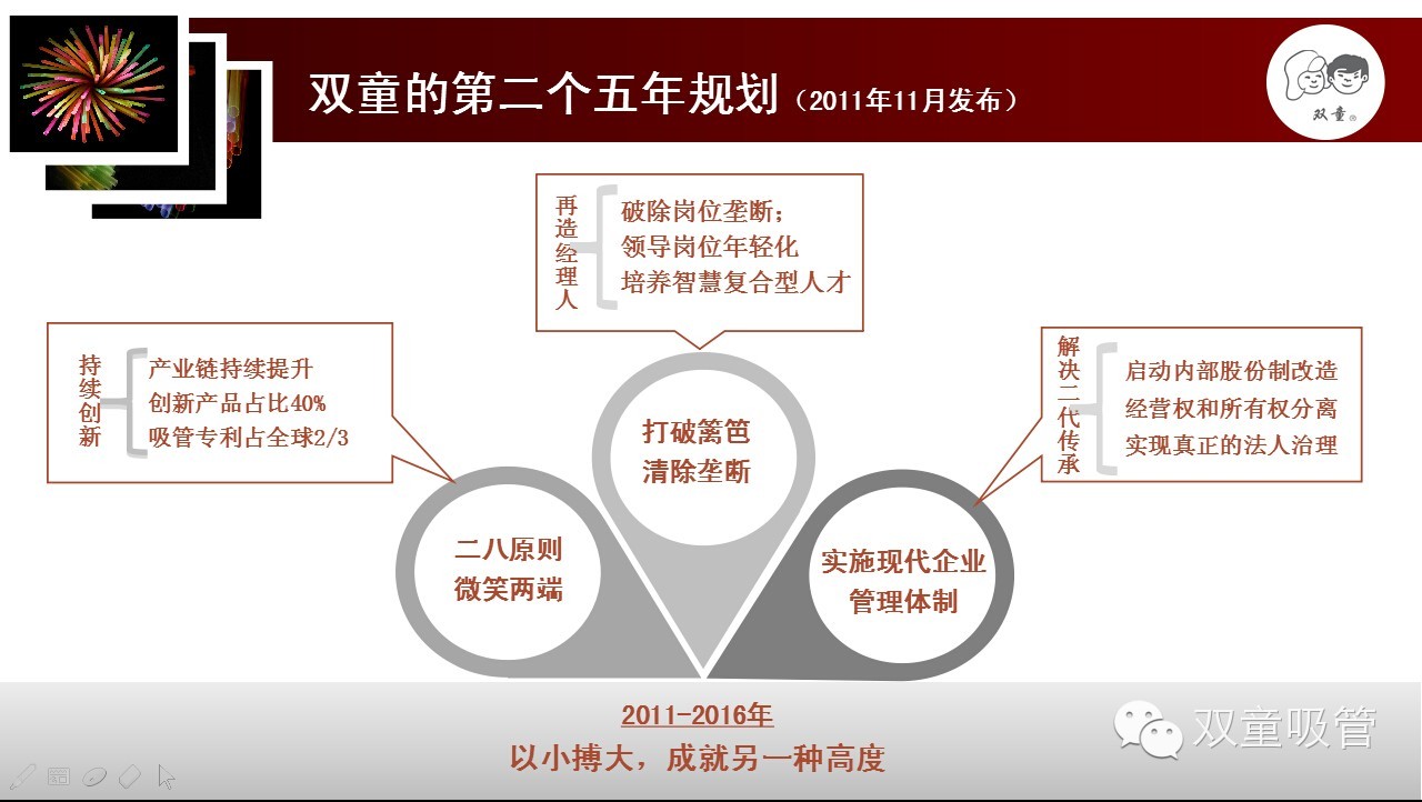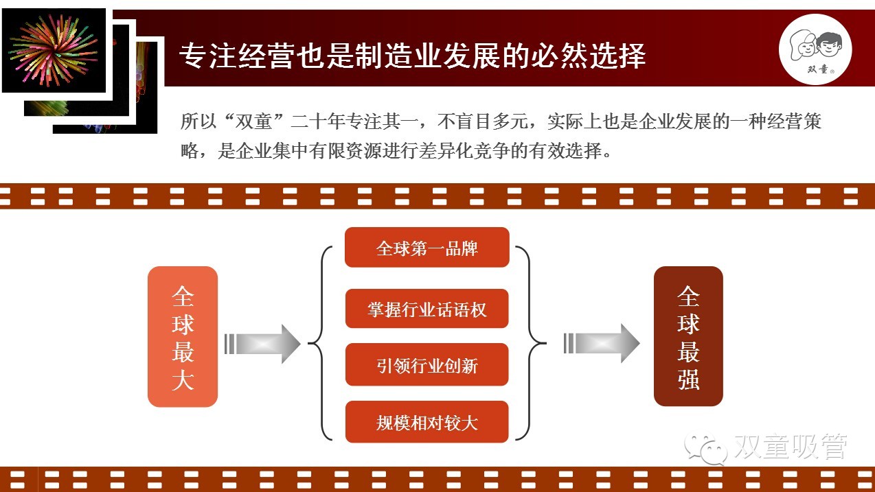 吸管是非大眾消費的邊緣產品,產品售價低,產業(yè)集聚度偏低,品牌附加值偏低。一路發(fā)展,雙童經歷了很多,也走了很多彎路。從2003年開始,雙童逐漸放棄貪大求全的粗放經營,重新回歸專注,只做吸管,追求產出最大化,抓住啞鈴兩端,明確了“五十年專注吸管不變”的發(fā)展規(guī)劃。