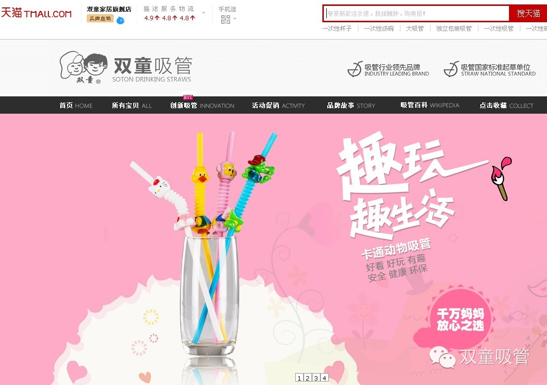 如今,在雙童天貓旗艦店網(wǎng)頁上展示著愛心、動物、雙人吸管、兒童吸管等各種造型、不同功能的吸管,銷量也在節(jié)節(jié)攀升。