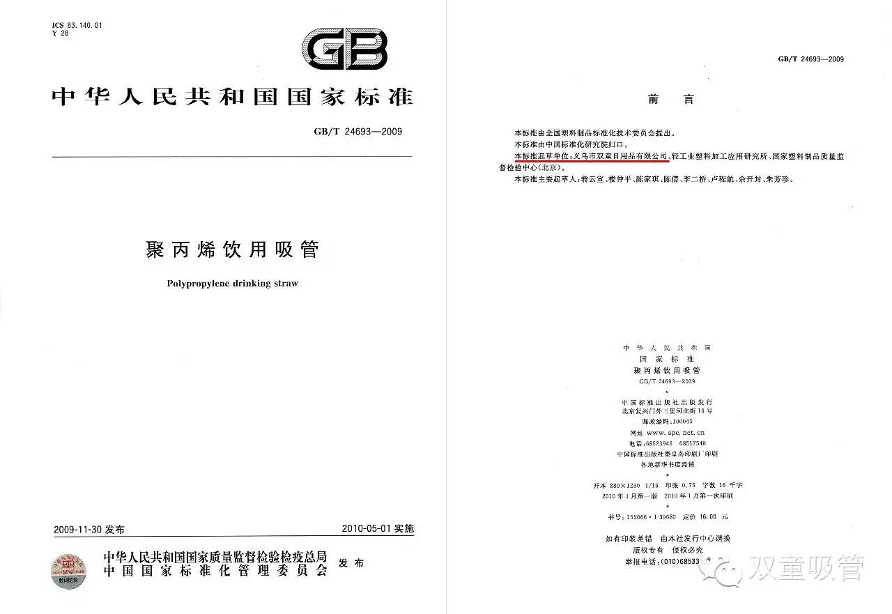 由雙童吸管起草發(fā)布的《聚丙烯飲用吸管》國家標準文件