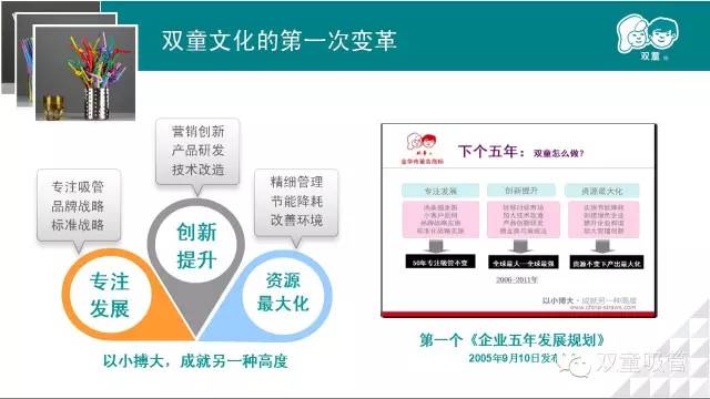 2005年9月13日,“雙童吸管”發(fā)布第一個(gè)“五年規(guī)劃”。樓仲平與開發(fā)團(tuán)隊(duì)一起,致力于思考除了喝飲料,吸管還能“干什么”?如何讓吸管“無奇不有”。于是,最近10年來,“雙童吸管”逐漸放棄了低端加工和薄利多銷,專注于高端市場的開發(fā)。憑借細(xì)致入微、持續(xù)不斷的產(chǎn)品創(chuàng)新,企業(yè)員工人數(shù)從原來的900名減少到了現(xiàn)在的350名,但員工的平均生產(chǎn)能力增加了數(shù)倍,以“減法”實(shí)現(xiàn)了“加法”。