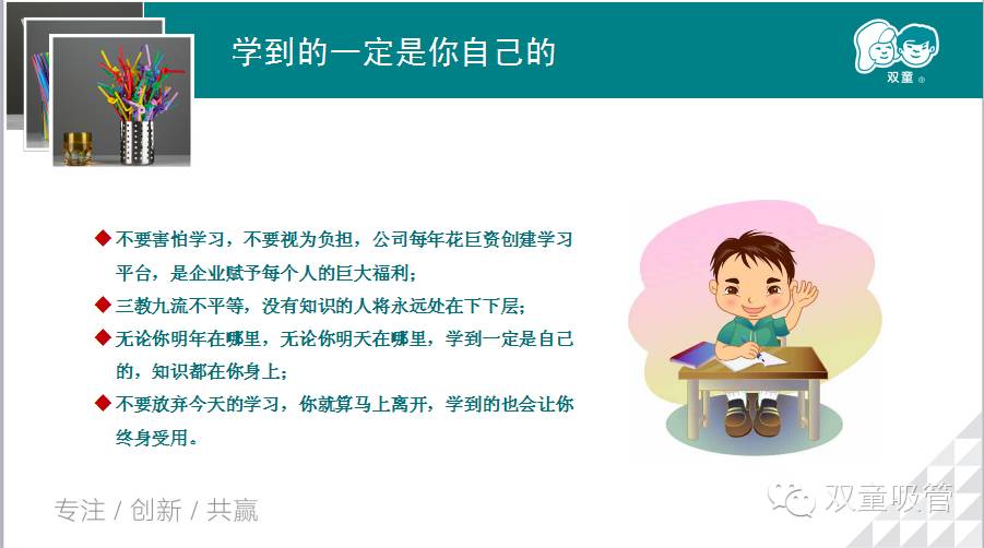 接下來樓總又分享了自己的成長經(jīng)歷,以自己的親身實例向大家說明了一句話:只要肯努力,肯學習,通過不斷地積累和改變,下一個老板可能就是你呢!同時也分享了“雙童”核心層的成長之路,這些從基層做起和雙童一起奮斗了十幾年的伙伴們也在不斷學習、不斷進取,不斷融入。雙童也因有大家而更精彩!