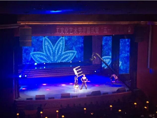 晚會(huì)在大合唱《咱們工人有力量》中拉開序幕。配樂詩(shī)朗誦、舞蹈、歌曲、樂器獨(dú)奏紛紛上臺(tái)表演,由國(guó)家一級(jí)演員張艷、大剛表演的雜技《足尖上的藝術(shù)》,把我們“雙童”的壽星們可都看驚呆了!