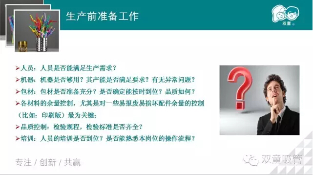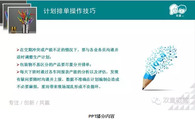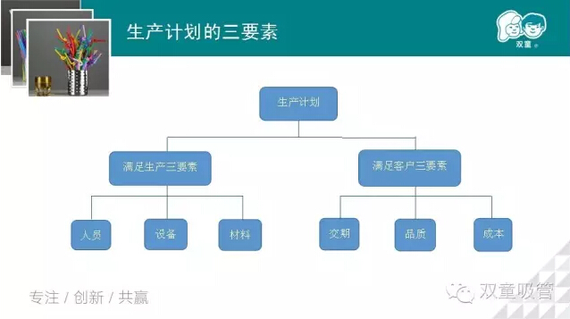 “雙童”堅(jiān)持“小客戶原則以來,每天車間的訂單都不少于200單,如何協(xié)調(diào)好這些單子,對(duì)生產(chǎn)計(jì)劃主管來說是一個(gè)大挑戰(zhàn)。張講師從生產(chǎn)計(jì)劃的作用,生產(chǎn)計(jì)劃的三要素,計(jì)劃工作的原則等方面闡述了生產(chǎn)計(jì)劃的重要性。那么,生產(chǎn)計(jì)劃的流程是怎樣的呢?生產(chǎn)計(jì)劃的注意事項(xiàng)及方法又有哪些呢,妞就放上我們講師的PPT和大家一起分享吧!