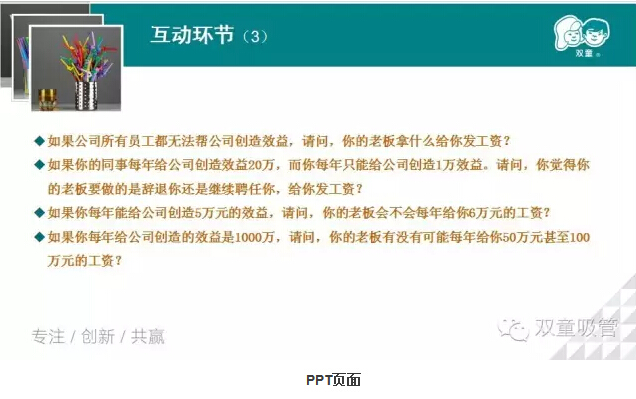 這次的學(xué)習(xí)會,吸管妞變身講師,和大家聊聊《誰給你發(fā)工資》。這不,一開場,吸管妞就和大家互動了起來,是誰給你發(fā)工資呢?