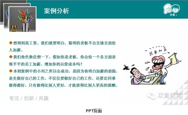 在學(xué)習(xí)會上,吸管妞也和童鞋們分享大膽地追求自己的工資。追求高工資沒什么不對,相反,這是一種向往理想和幸福生活的表現(xiàn)。所以,無論是迫于生活所需,還是出于自己對物質(zhì)生活的要求,渴望高工資并不是什么虛榮心理,所以并不需要遮遮掩掩。