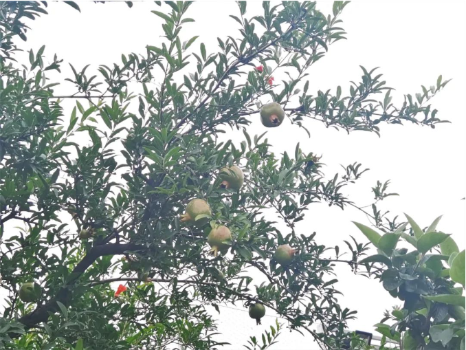 還有零星幾朵石榴花,把石榴襯得像一個(gè)個(gè)的小燈籠