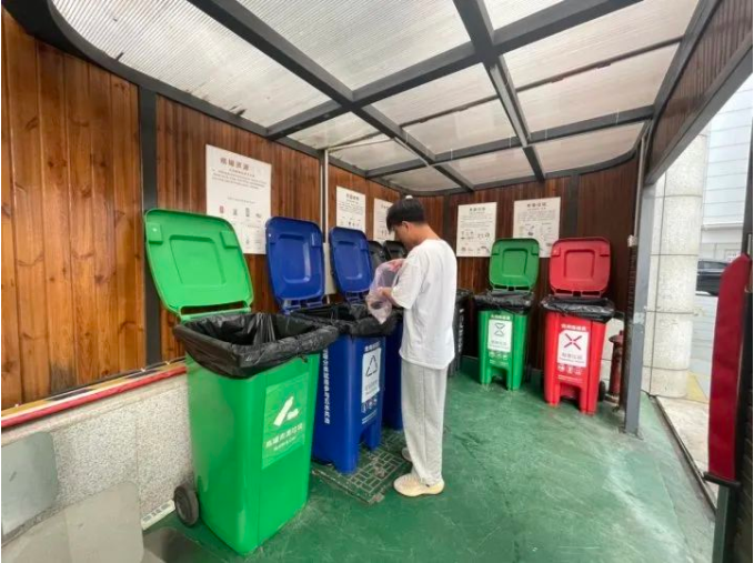 在“雙童”的垃圾投放房里各有紅綠藍黑等多個顏色的垃圾分類桶,分別將廠區(qū)的生活垃圾分為了易腐垃圾、其他垃圾、可回收物、有害垃圾四大類。