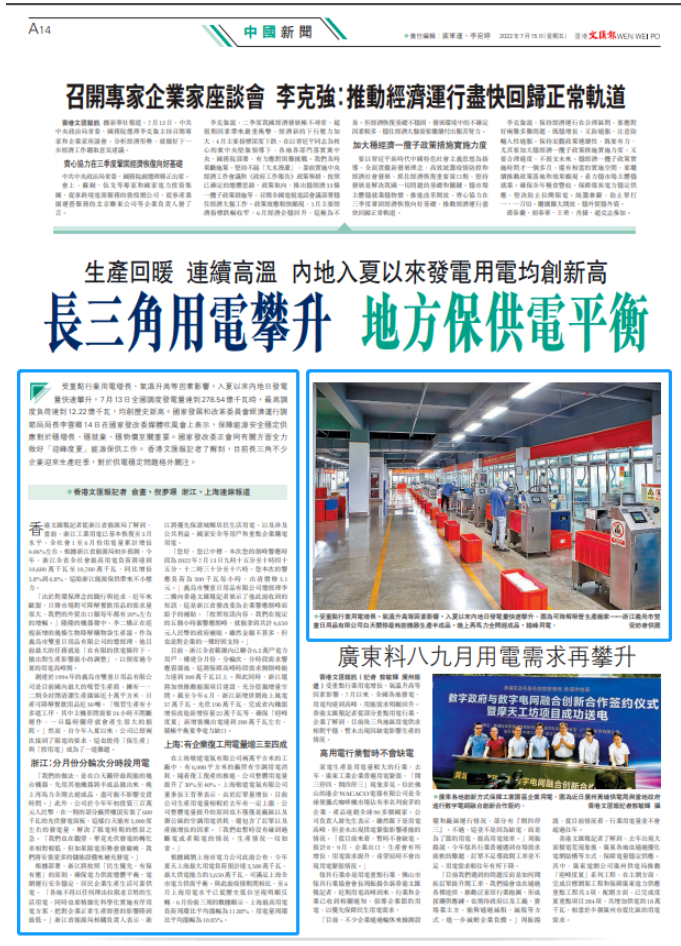 「您好,您已中標(biāo),本次您的削峰響應(yīng)時段為2022年7月13日九時十五分至十時四十五分、十二時三十分至十六時。您本次的響應(yīng)負(fù)荷為300千瓦每小時,出清價格3.1元?!沽x烏市雙童日用品有限公司總經(jīng)理李二橋向香港文匯報記者展示了他此前收到的短訊,這是浙江省發(fā)改委為企業(yè)響應(yīng)削峰而給予的補(bǔ)貼?!赴凑斩逃崈?nèi)容,我們在規(guī)定的五個小時里響應(yīng)削峰,就能拿到共計4,650元人民幣的政府補(bǔ)貼。雖然金額不算多,但也是對企業(yè)的一種紓困支持。」目前,浙江全省范圍內(nèi)已聯(lián)合6.2萬戶電力用戶,構(gòu)建分月份、分輪次、分時段需求響應(yīng)資源池,這將保障高峰時段需求側(cè)削峰能力達(dá)到300萬千瓦以上。與此同時,浙江還將加快推動能源項目建設(shè),充分挖掘增量空間。截至今年6月,浙江新增并網(wǎng)海上風(fēng)電37萬千瓦、光伏190萬千瓦,完成省內(nèi)機(jī)組增容改造新增容量22萬千瓦等,確?!赣宥认摹剐略鲅b機(jī)出電達(dá)到200萬千瓦左右,積極平衡夏季電力缺口。