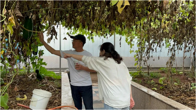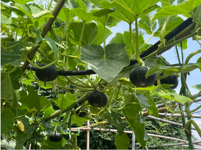 秋季不愧是收獲的季節(jié),在園丁叔叔的辛勤栽培下,空中菜園現(xiàn)在可謂是處處都是寶!看,這一大片的冬瓜像是通關(guān)游戲里的木樁似的,想過去這條路可還真的不容易。這細細的莖條還能掛住這么大的冬瓜,太牛了!
