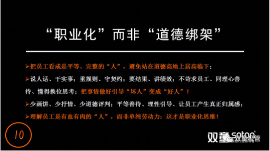 在“理性”思維的持續(xù)引導(dǎo)下,“雙童”在文化中倡導(dǎo)把員工看成是平等、完整的“人”,而非站在道德高地上居高臨下,處處體現(xiàn)尊重、公平和雙贏。我們理解員工是有血有肉的“人”,而非單純的勞動(dòng)力,對待員工少“畫餅”,少抒情,懂得換位思考,不去“道德綁架”員工,才能讓員工真正產(chǎn)生歸屬感。