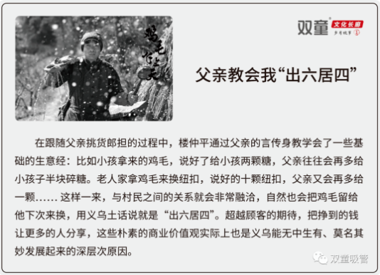 1979年時(shí)期的“雞毛換糖”,義烏廿三里已經(jīng)形成了提籃市場(chǎng)。所以我去挑貨郎擔(dān)時(shí)已經(jīng)不再是簡單的用糖去換雞毛了,而改用牛皮筋、發(fā)夾、紐扣等小百貨去換“雞毛”。我們“雞毛換糖”的地區(qū)主要是山區(qū),通常我們都會(huì)4點(diǎn)起床,5點(diǎn)出門,先走出去20多公里,趕三四個(gè)小時(shí)的路,然后到規(guī)劃當(dāng)中最遠(yuǎn)的村莊,一邊換雞毛一邊往回走。這樣一來,雞毛換的越來越多,擔(dān)子越來越重時(shí),也離回家的路程越來越近了,從而也就減少了體力消耗。那一年的春節(jié),半個(gè)多月的時(shí)間,雖然每天都要翻越百里路,道路崎嶇,路途艱險(xiǎn),但我自己并不覺得有多辛苦。磨破腳皮,讓我第一次真正賺到了十多塊錢?;丶乙院?,爸爸再怎么罵我,死活也不去上學(xué)了……