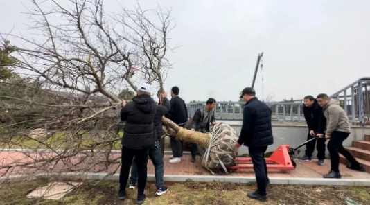 用搬運車在樓頂接應(yīng)大樹