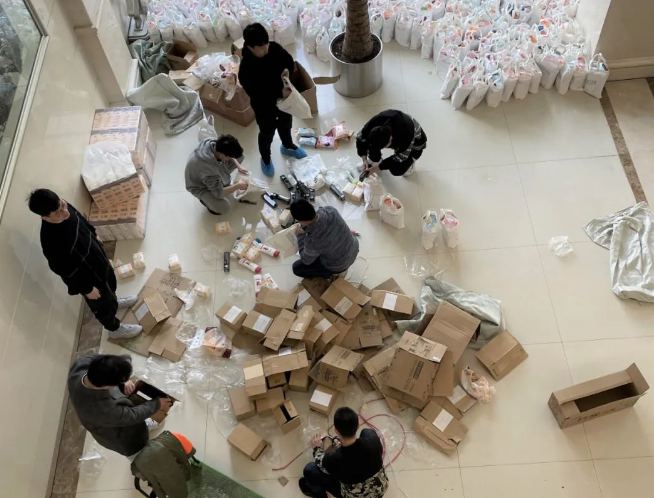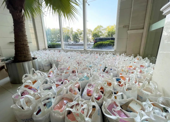 幾百份禮品整理排列,等待領(lǐng)取