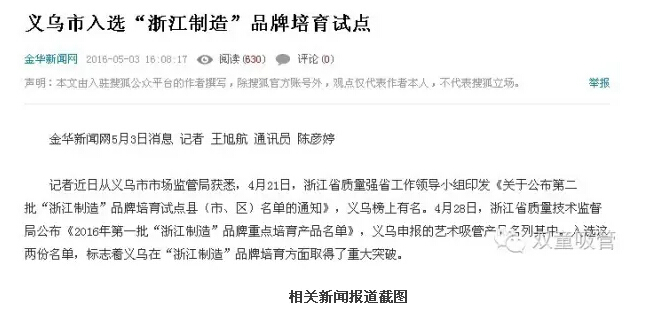 2014年底,浙江在全國率先以標(biāo)準(zhǔn)和認(rèn)證為手段打造首個(gè)區(qū)域性公共品牌——“浙江制造”品牌。“浙江制造”標(biāo)準(zhǔn)比國家及行業(yè)標(biāo)準(zhǔn)要求更高,達(dá)到國際先進(jìn)、國內(nèi)一流水平。4月28日,浙江省質(zhì)量技術(shù)監(jiān)督局公布《2016年第一批“浙江制造”品牌重點(diǎn)培育產(chǎn)品名單》,我們“雙童”代表義烏申報(bào)的吸管產(chǎn)品名列其中。標(biāo)志著義烏在“浙江制造”品牌培育方面取得了重大突破。
