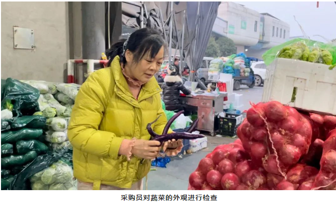 采購現(xiàn)場,每一種菜品都要經(jīng)過采購員的嚴(yán)格檢查,不僅是要對品種進行對比,選出最好吃的種類,還要考量菜品的質(zhì)量,外觀得要好看,不管是茄子還是土豆都要有“顏值”。