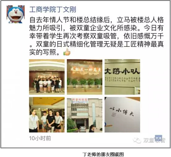 據(jù)丁老師自己介紹,他之前來(lái)過(guò)一次“雙童”,當(dāng)家人樓總帶著他參觀了企業(yè)后,對(duì)我們的精細(xì)化管理深表贊賞,離開(kāi)了之后也一直念念不忘。就連學(xué)生的開(kāi)學(xué)第一天,他就號(hào)召大家關(guān)注“雙童”的官方微信,時(shí)刻關(guān)注我們的動(dòng)態(tài)向我們學(xué)習(xí)。(吸管妞肺腑之言:這樣的班主任,請(qǐng)給我來(lái)一打!)