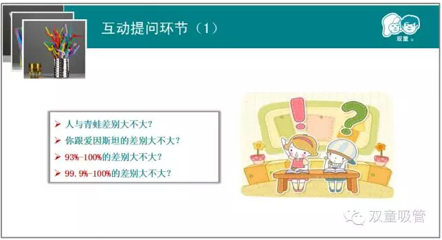 這不,一開場,互動環(huán)節(jié)就停不下來啦!“人與青蛙的差別大不大?你與愛因斯坦的差別大不大?99.9%—100%的差別大不大?”如此有趣的互動問題童鞋們也是爭相恐后的回答呢!你沒說到的我補充,我說到的你來延展?,F(xiàn)場的學(xué)習(xí)氛圍可真是十分融洽呢!