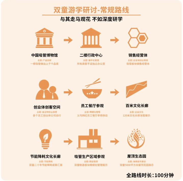 此外,我們還會(huì)帶領(lǐng)大家現(xiàn)場(chǎng)參觀 全球首家吸管博物館, “雙童”清潔無塵車間, 每年省下300多萬的節(jié)能降耗系統(tǒng), 集雙童故事、文化、經(jīng)營(yíng)理念等于一身的文化長(zhǎng)廊, 還有5000㎡的空中生態(tài)園! 更可現(xiàn)場(chǎng)觀摩“雙童”獨(dú)特的內(nèi)部創(chuàng)業(yè)模式, 與各創(chuàng)業(yè)體負(fù)責(zé)人互動(dòng)交流, 探尋“雙童”獨(dú)特的文化魅力!