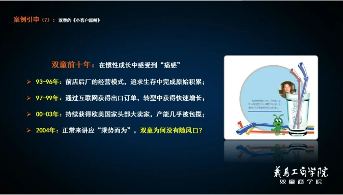 那么,“雙童”是如何通過錯位競爭一步步成為行業(yè)“隱形冠軍”的呢?早在2004年,“雙童”就刻意避開工業(yè)配套類吸管這個賽道,打破“吸管就是喝飲料的”基本假設,通過要素創(chuàng)新,掌握了全球吸管產(chǎn)業(yè)2/3的專利,一步步進入吸管產(chǎn)業(yè)鏈的頂端。長期堅持的標準化戰(zhàn)略之路,也讓“雙童”在制定標準的過程中,牢牢掌握了一定的行業(yè)話語權和規(guī)則制定權!錯位競爭就是要企業(yè)避開巨頭和領先企業(yè)占據(jù)主導地位的正面競爭,圍繞自己可能的擅長,尋找到合適的錯位,建立自己的競爭優(yōu)勢。從1997年開始,“雙童”已經(jīng)充分利用互聯(lián)網(wǎng)技術,外貿(mào)出口比例一度達到90%以上。但“雙童”意識到,所謂的“大客戶”,不僅利潤低下,還嚴重擠壓了企業(yè)優(yōu)質中小客戶的訂單,對企業(yè)未來發(fā)展是很不利的。從2004年開始,“雙童”開始慢慢放棄“大客戶”,繞開習慣依賴的經(jīng)驗主義,轉而推行“小客戶原則”。通過戰(zhàn)略轉變,“雙童”把原先每100根吸管僅8分錢的利潤,提升到了有20%以上利潤率的提價空間,牢牢掌握了“雙童經(jīng)營的主動權。