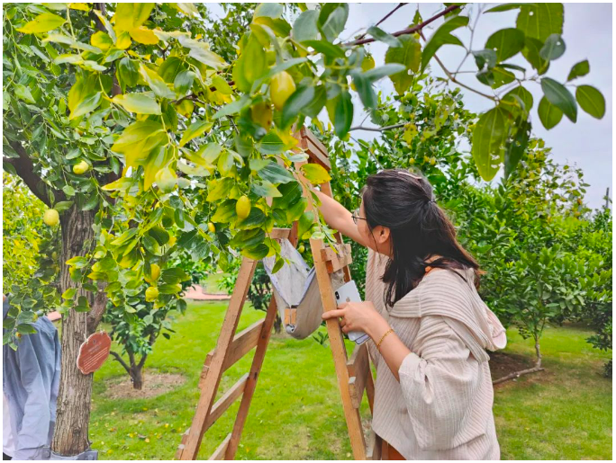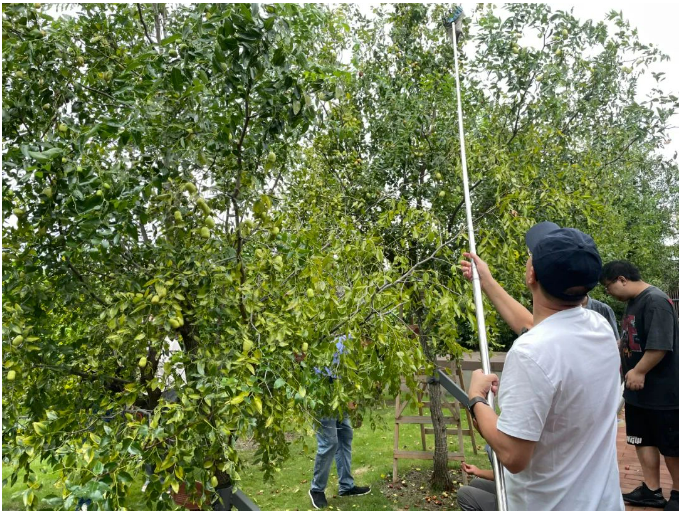 用手搖、用竹竿敲、爬梯子摘、在樹下?lián)炻?/strong>為了能裝滿自己的小籃子,大家也都沒閑著,“各顯神通”,現(xiàn)場是一片“手忙腳亂”!