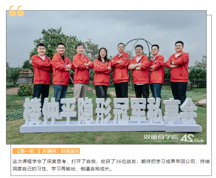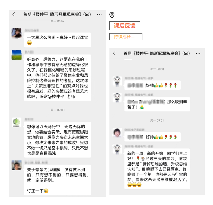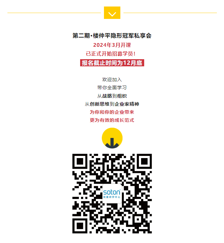 目前,樓仲平隱形冠軍私享會第一期已結束第一模塊的學習,接下來繼續(xù)開展6大模塊,主題分別為“破圈”、“取舍”、“進化”、“案例”、“出發(fā)”、“開悟”,一起期待吧!