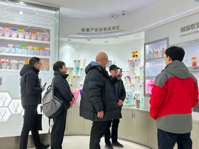 調(diào)研團(tuán)身后展示的是雙童其他創(chuàng)業(yè)體的非吸管產(chǎn)品!