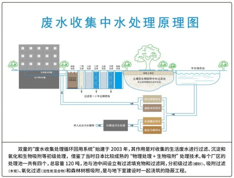 除此之外,“雙童1號樹”的土層下,還建有一個土壤層生物吸附過濾池,員工們使用后的生活廢水,經過過濾后,會匯聚到“ 雙童一號樹”下進行生物吸附處理。