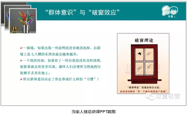 一個組織內(nèi)部,如果有了一些垃圾而沒有及時清理,緊接著就會有更多垃圾,最終人們會理所當(dāng)然地將垃圾順手丟棄在地上。所以群體意識決定了你會養(yǎng)成什么樣的“習(xí)慣”,而你的習(xí)慣也會影響著整個集體。