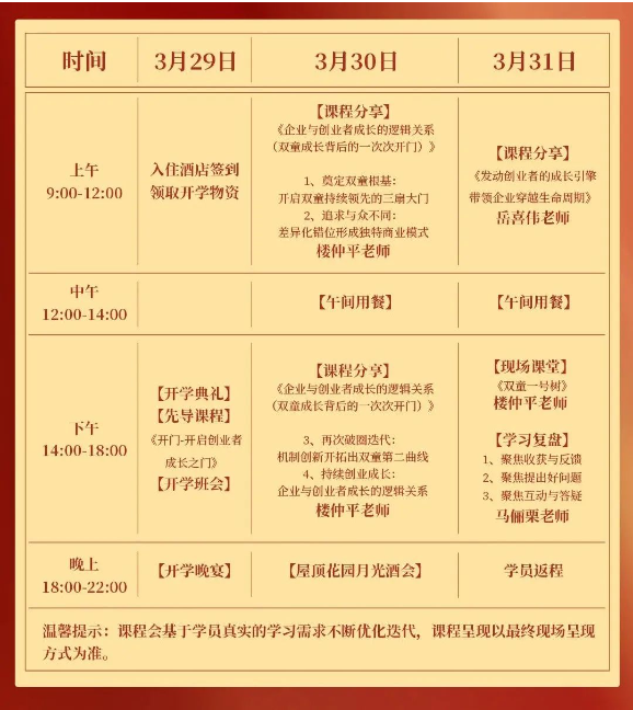 課程交付中,樓仲平老師將分享其成長(zhǎng)背后的底層邏輯《企業(yè)與創(chuàng)業(yè)者的邏輯關(guān)系》,岳喜偉老師則帶來(lái)《發(fā)動(dòng)創(chuàng)業(yè)者的成長(zhǎng)引擎帶領(lǐng)企業(yè)穿越生命周期》課程分享。