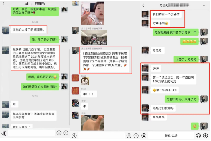 為了能夠助力更多中小企業(yè)也能運(yùn)用這套機(jī)制實(shí)現(xiàn)快速增長,雙童商學(xué)院早在2022年,雙童商學(xué)院就針對該機(jī)制打磨成《自主制創(chuàng)業(yè)裂變營》課程,并不斷地升級迭代,該課程已經(jīng)是一套非常成熟的、可復(fù)制、可實(shí)踐的課程,完全契合中小微創(chuàng)業(yè)者的需求,報(bào)名人數(shù)也從原來的幾十人變成現(xiàn)在期期爆滿的“百人團(tuán)”!