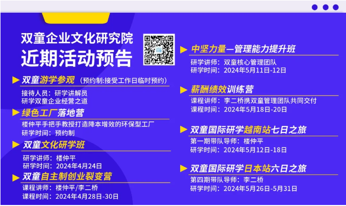 沒趕上本次《冠軍之旅》的朋友也別擔心,2024年5月26日,雙童總經(jīng)理李二橋也將帶領(lǐng)30多位企業(yè)家朋友一起,走進世界500強企業(yè)、百年長壽企業(yè)、專精特新企業(yè),深入企業(yè)工廠內(nèi)部,從“細枝末節(jié)”處考察,全方面學習優(yōu)秀經(jīng)營理念,助力企業(yè)成長!