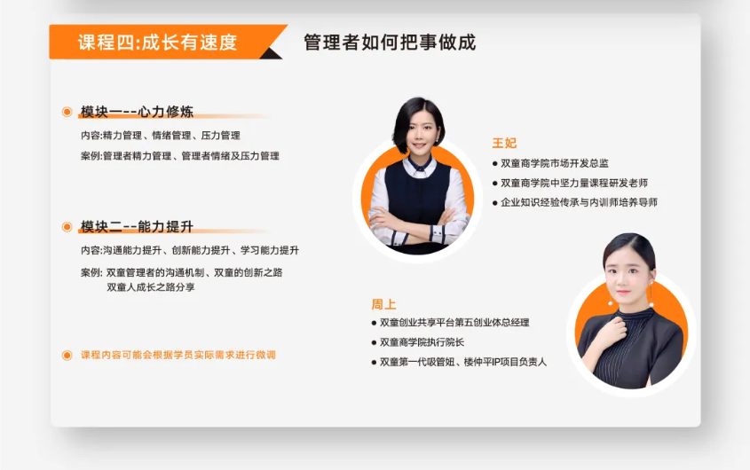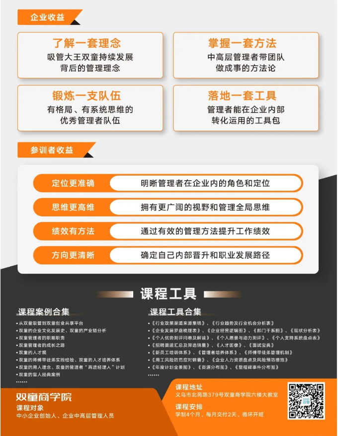 該課程學制為4個月,每月交付2天完成一個課程主題學習,循環(huán)開班。為了不耽誤企業(yè)正常運轉,更好安排中層管理集中學習,開課時間一般會安排在周六日。
