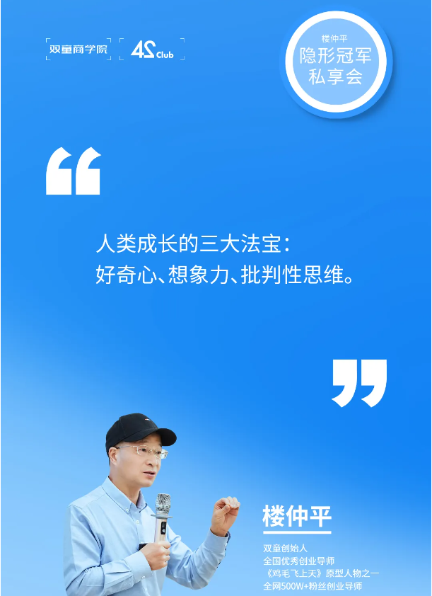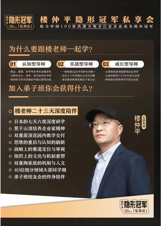 【樓仲平隱形冠軍私享會】是樓總唯一一個全面系統(tǒng)交付46年創(chuàng)業(yè)歷程的經(jīng)驗總結(jié)和思維模型的課程。全年6期課程,樓老師23天深度陪伴,從戰(zhàn)略到組織,從創(chuàng)新思維到企業(yè)家精神,幫助你的企業(yè)全方位升級。