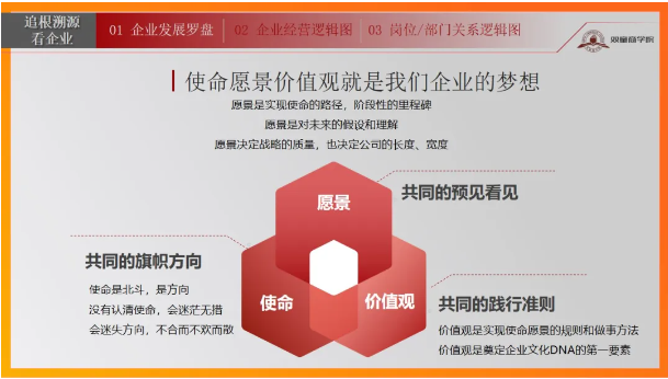 “追根溯源看企業(yè)”旨在讓參訓(xùn)學(xué)員明確自己企業(yè)發(fā)展目標(biāo)、夢(mèng)想,并推動(dòng)目標(biāo)的實(shí)現(xiàn);正確認(rèn)知企業(yè)經(jīng)營現(xiàn)狀,明確企業(yè)盈利的關(guān)鍵點(diǎn)和卡點(diǎn);掌握科學(xué)合理地劃分部門與崗位的依據(jù)和方法。