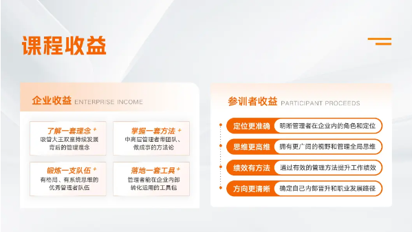 《中堅(jiān)力量》全課程按照思維有高度、帶人有溫度、做事有力度、成長(zhǎng)有速度四個(gè)主題分期交付,秉著實(shí)用主義的原則,各位老師在課程交付中,不僅拆解原理,還直接給工具、給方法,以幫助參訓(xùn)企業(yè)全方位的提供管理者綜合素養(yǎng)!