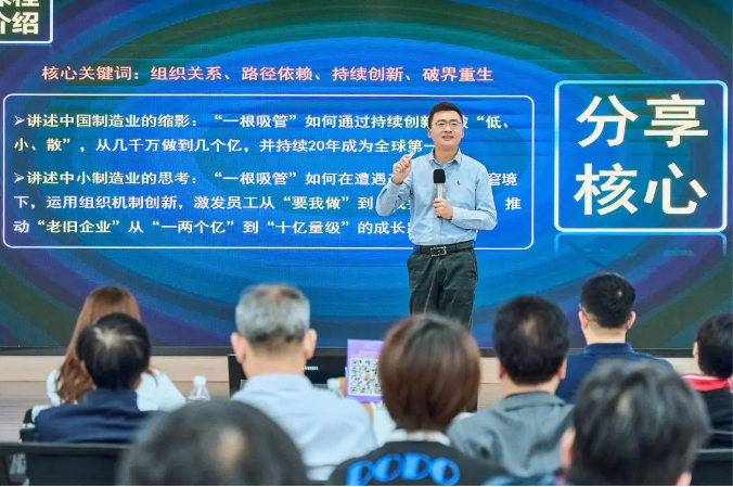 現(xiàn)場(chǎng)課堂結(jié)束后,為了讓商會(huì)研學(xué)團(tuán)更深入地了解“雙童”,總經(jīng)理李二橋分享《制造業(yè)極致專注后的“新活法”》,他以“雙童”自身近三十年的發(fā)展為案例,講述“雙童”持續(xù)20年成為吸管行業(yè)的全球第一,都做對(duì)了哪些事情;深度剖析傳統(tǒng)中小企業(yè)在到達(dá)產(chǎn)業(yè)天花板之后,通過組織機(jī)制創(chuàng)新,讓企業(yè)重新充滿生命力的方法,引發(fā)了全場(chǎng)參與者的共鳴!