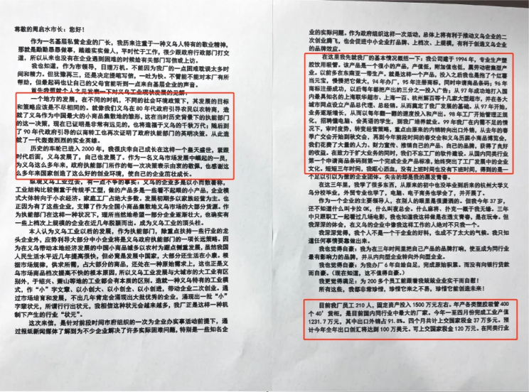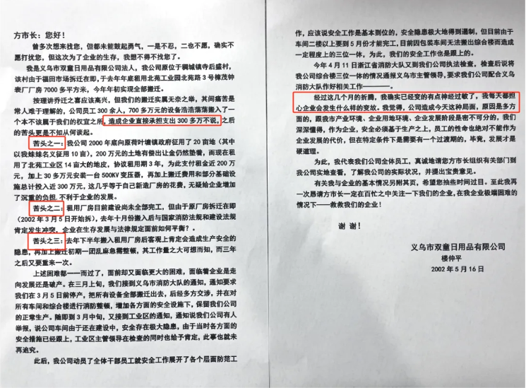 在“走投無(wú)路”的情況下,創(chuàng)始人樓仲平在2002年5月16日第一次向政府發(fā)出兩封求助信!他分別給時(shí)任義烏市市長(zhǎng)周啟水、主管工業(yè)的副市長(zhǎng)方浩福寫信,詳細(xì)介紹了“雙童”的發(fā)展成績(jī)和當(dāng)下難以為繼的困局,期望政府能夠幫助企業(yè)渡過(guò)難關(guān)!