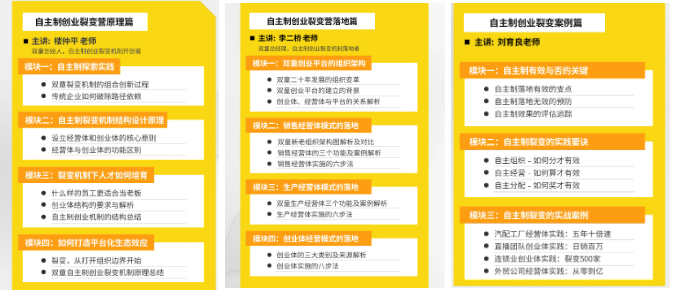 理論是實(shí)踐的基礎(chǔ),先弄清楚機(jī)制的運(yùn)行原理,才能談得上有效實(shí)踐!所以在課程交付過程中,講師樓仲平會花費(fèi)一整天的時(shí)間,將課程干貨分為四大模塊,共11小節(jié),為學(xué)員深度解析自主制創(chuàng)業(yè)裂變的機(jī)制原理!
