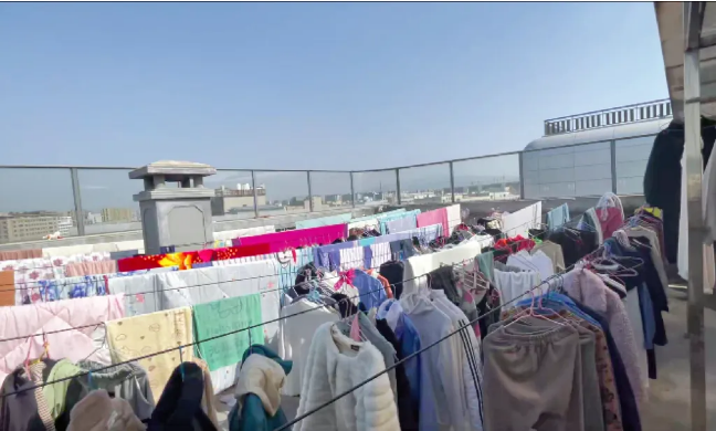 在員工宿舍9樓,“雙童”設有一個露天洗衣房,這個區(qū)域大約有兩三百平方米。為了應對多變的天氣條件,該區(qū)域上方安裝了陽光板。這樣做的原因是為了在晴天時讓陽光充分照射進來,使衣物能夠得到充足的日曬,同時在雨天又能防止衣物被淋濕。