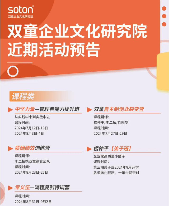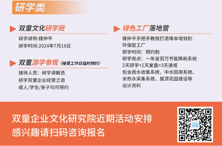 如果你也對“雙童”如何通過精細化管理引領新風尚充滿好奇,渴望為你的團隊注入成長的新動力,歡迎走進7月18日【雙童文化研學班】,與上百位優(yōu)秀的創(chuàng)業(yè)者一起學習!少量名額,歡迎咨詢鎖定!