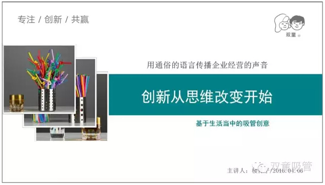 每年四月份,我們的當家人樓總就在學習會中給員工們分享了《創(chuàng)新從思維改變開始》的課程,鼓勵員工們多多創(chuàng)新,動員大家多多參與到即將舉辦的首屆吸管創(chuàng)意大賽中。他說,全球最頂尖的吸管一定在“雙童”,沒有人比我們更了解吸管,相信員工們一定可以提交上來非常棒的創(chuàng)意作品!