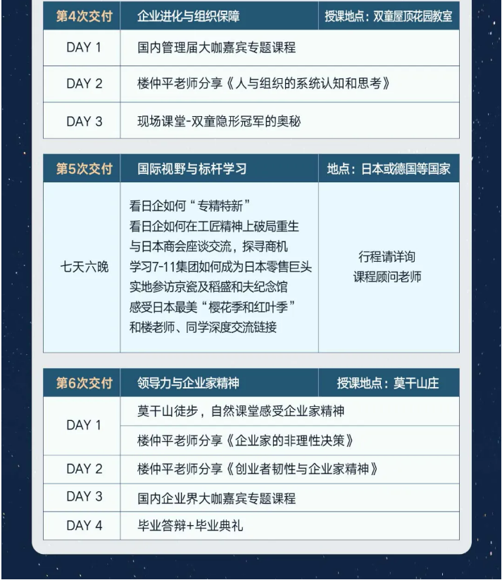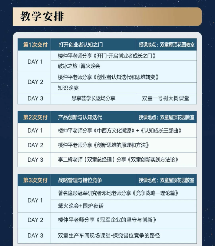 一年陪跑、7大模塊,樓老師將花費(fèi)24天時間深度陪伴學(xué)員成長,圍繞《打開創(chuàng)業(yè)者認(rèn)知之門》、《產(chǎn)品創(chuàng)新與認(rèn)知迭代》、《戰(zhàn)略管理與錯位競爭》、《企業(yè)進(jìn)化與組織保障》、《國際視野與標(biāo)桿學(xué)習(xí)》、《領(lǐng)導(dǎo)力與企業(yè)家精神》等6大主題內(nèi)容和同學(xué)們做深度地閉門分享。