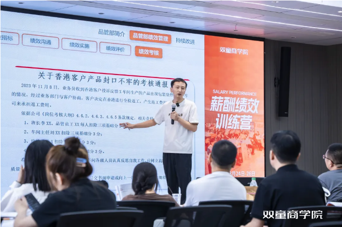 最后一天的課程交付中,會由作為“雙童”品管部門的負(fù)責(zé)人陳學(xué)森老師為大家分享部門案例。陳學(xué)森老師經(jīng)歷了“雙童”品管薪酬績效構(gòu)成的各個(gè)時(shí)期,所以他在課程中,以自身豐富的實(shí)戰(zhàn)經(jīng)驗(yàn)通過考核分析、工資框架、梳理指標(biāo)、各崗位指標(biāo)、績效溝通、績效實(shí)施、績效評價(jià)、績效考核、客戶投訴績效考核等九個(gè)方面,事無巨細(xì)地向?qū)W員演示薪酬績效體系在實(shí)操環(huán)節(jié)遇到各種問題和解決方案。