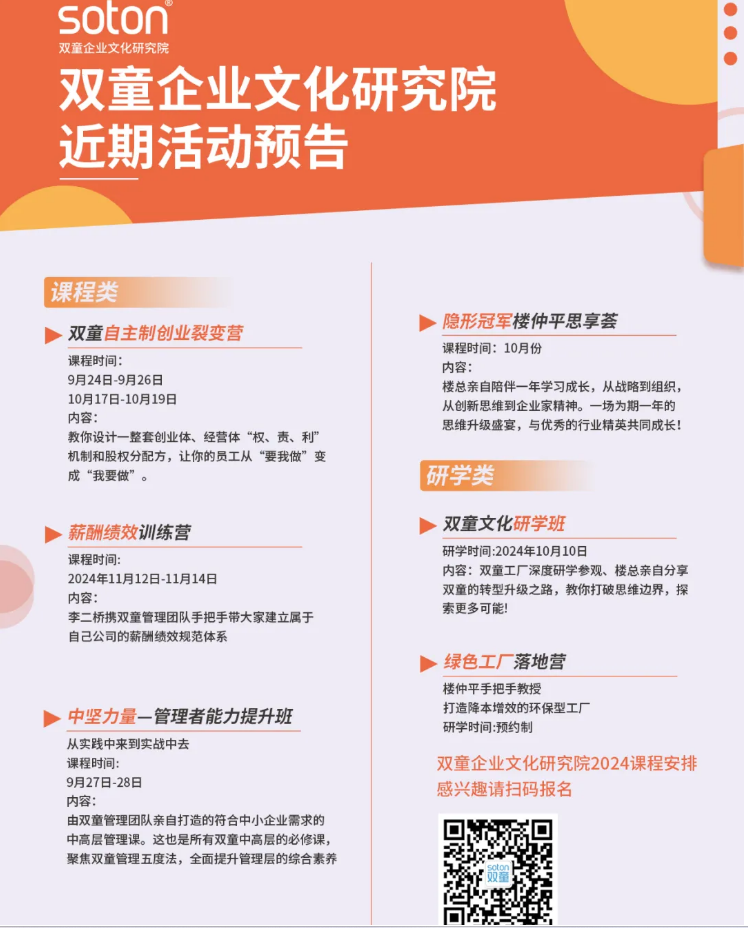 企業(yè)管理者,要把握好不同員工精神欲望,要勾起這種欲望,就要求管理者懂人性、識人心。所以,在“雙童”這種開放包容的企業(yè)組織下,大家都愿意交流,不同思想碰出火花,員工認(rèn)知就提升了,積極的情緒又驅(qū)動行為的產(chǎn)生,創(chuàng)新的概率由此增加,生產(chǎn)力自然而然也就提高了!