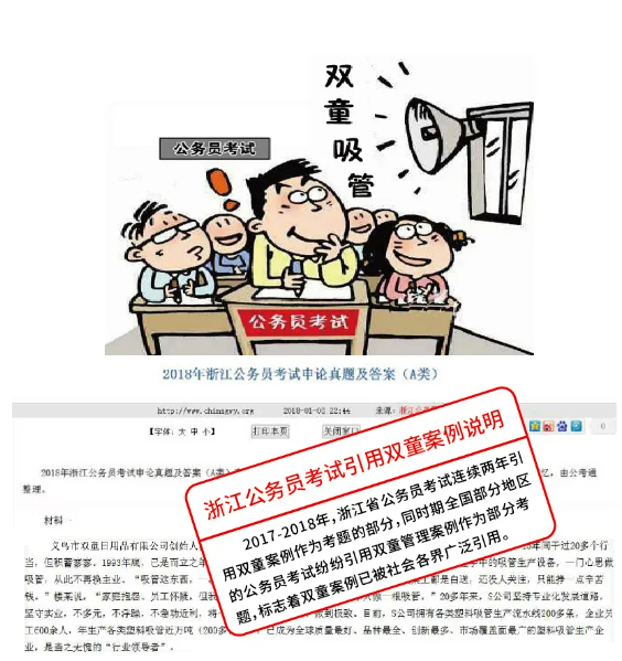2015年以來,雙童案例逐漸被各大院校MBA大量采用。2016年,雙童案例出現(xiàn)在甘肅、樂山公務員和蘭州大學附中期末考試的試題上,受到《人民網(wǎng)》的關注和報道。2017年,雙童堅守實業(yè)的工匠精神成為浙江企業(yè)標桿案例被列入浙江省公務員考題。