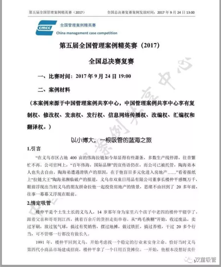 其中浙江工業(yè)大學和南京大學采編的管理案例分別被評為2016年和2017年度全國管理案例的百優(yōu)案例。在2017年全國管理案例精英賽中,《以小博大,一根吸管的藍海之旅》被指定為總決賽的PK案例。截至目前,以“雙童”為主題的案例進入到國家案例庫的數(shù)量就有十多件。