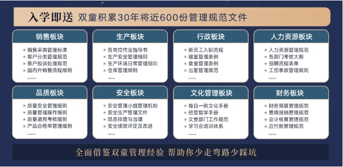 所以,入學(xué)“隱形冠軍樓仲平思享薈”之后,項目組會將“雙童”積累了30年、包含了銷售、生產(chǎn)、行政、人類資源、品質(zhì)、安全和文化管理7大板塊,將近600分管理規(guī)范文件,全部打包給學(xué)員,幫助學(xué)員企業(yè)能夠全面借鑒雙童管理經(jīng)驗(yàn)、少走彎路、少踩坑!